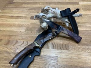 Manche en noyer avec rajout d’une douille pour verrouillage de l’étui, garde en laiton et lame en Xc75( acier carbone)