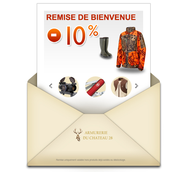 Bénéficiez de 10% de remise sur votre 1ère commande, sur l’ensemble du site (hors déstockage et armes) avec le code qui vous sera envoyé lors de votre confirmation d’abonnement.