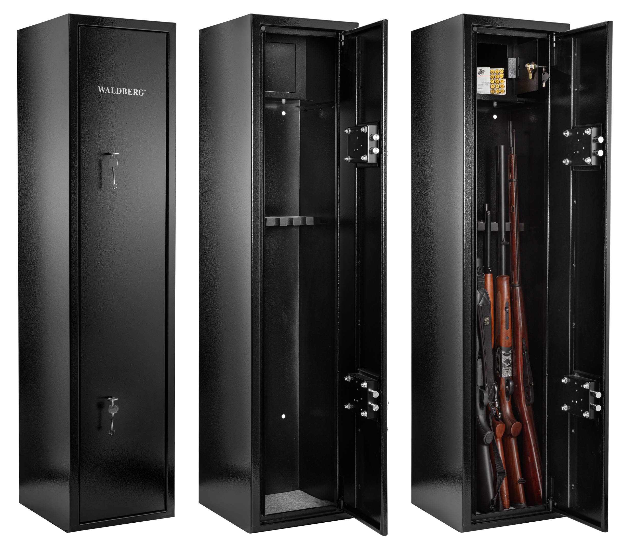 Porte mince équipée de 2 serrures à clefs actionnant directement les pennes. Intérieur des coffres peints en noir avec moquette grise au sol. Aménagements selon modèles. Tablette à droite du coffre à munition amovible pour placer un fusil à canon long (> 76 cm).