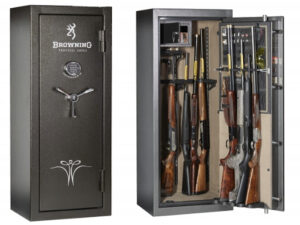 Cette armoire forte Browning Zenith 19 armes est un coffre digital renforcé, haut de gamme, pour armes longues qui permet de ranger en sécurité 19 fusils ou carabines avec lunettes. Un soin particulier a été apporté à l’aménagement intérieur avec tablettes réglables, compartiments de rangement dans la porte.