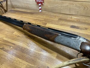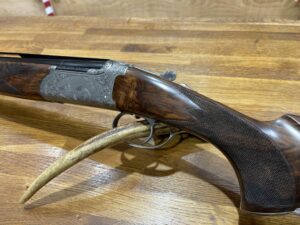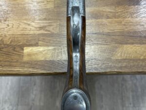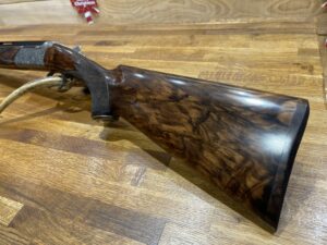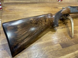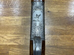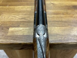 Bascule entaillée avec nouvelle relime ronde artisanale de la bascule et des coquilles. Gravure main signée par un Maître Graveur avec ornementation en demi fond creux et scènes de chasse gravées en taille douce sur les deux côtés et sous la bascule.Crosse pistolet avec pontet long ourlé en Noyer luxe 5 Étoiles et plaque de couche en Noyer quadrillé. Tous les bois sont poncés huilés et les quadrillages faits à la main avec un pas type grain de poudre et une quadrille continue qui couvre la totalité de la poignée. Livré en mallette prestige Chapuis Armes.