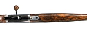 Carcasse monobloc en alliage Fortal 7075 avec anodisation grise. Gravure laser avec ornementation en feuille d’acanthe et scène de chasse de chaque côté de la carcasse. Crosse pistolet avec joue Monte Carlo et devant tulipe en Noyer Luxe 4 Étoiles poncé huilé. Nouvelle calotte avec clé universelle posée à la poignée. Plaque de couche anti-recul. Levier d’armement avec boule en Noyer. Chargeur rotatif amovible. Canon interchangeable avec hausse triangulaire luminescente breveté et guidon réglable en hauteur.