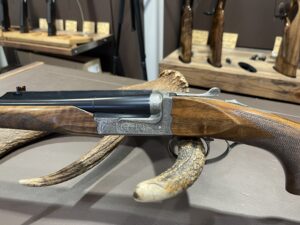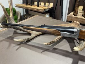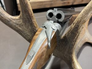 Gravure avec ornementation en double anglaise gravé en fond creux et trophée de sanglier gravé en médaillon sous la bascule