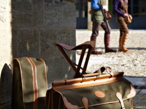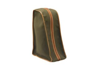 Sac à bottes en toile et en cuir avec une poignée à l’arrière pour le transport.